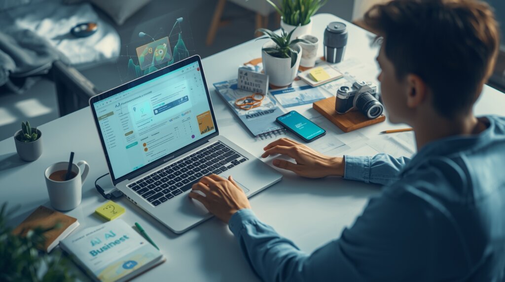 You start a small business where AI helps you do important tasks like writing, designing, planning, editing, researching, organizing, or customer support. AI doesn’t “run everything” by itself. It’s more like a helpful assistant who never gets tired and doesn’t complain when you ask for the 12th rewrite.